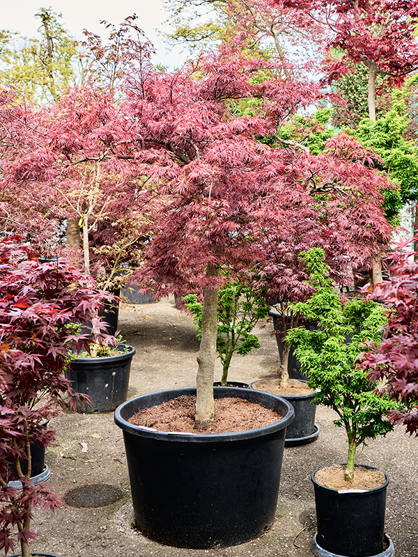 De Acer palmatum vraagt weinig onderhoud. Geef regelmatig water in droge periodes, vooral bij potbeplanting, maar voorkom dat de wortels te nat staan. Snoeien is meestal niet nodig; eventuele vormcorrecties kun je het best in de late winter uitvoeren. Een jaarlijkse laag organische meststof in het voorjaar ondersteunt een gezonde groei en intense bladkleuren.