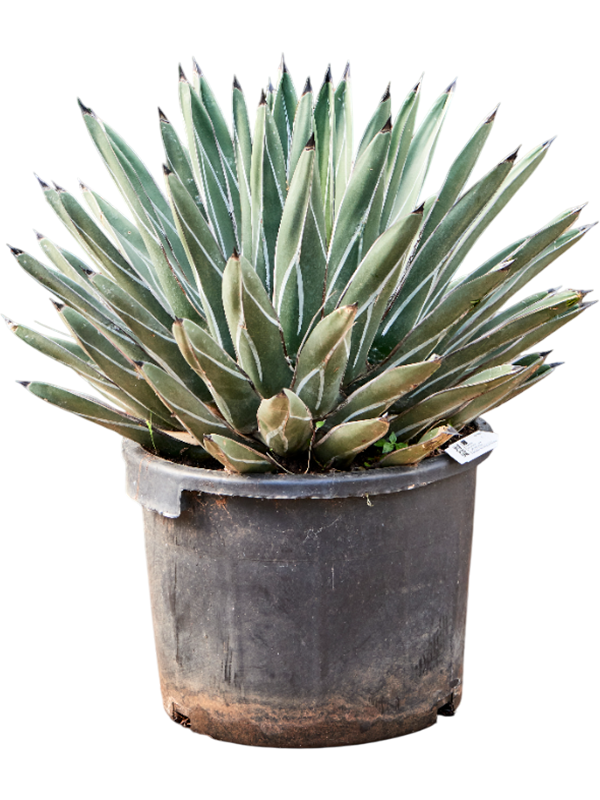Deze plant vraagt weinig onderhoud. Geef pas water als de grond volledig droog aanvoelt; te veel vocht kan wortelrot veroorzaken. De Agave Ferdinandi Regis staat in grond en heeft geen extra voeding nodig om mooi compact te blijven. Door haar trage groei behoudt ze jarenlang haar krachtige vorm zonder te hoeven snoeien of verpotten.