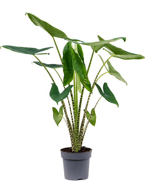 De Alocasia Zebrina staat in grond en heeft graag een licht vochtige potkluit. Geef regelmatig kleine beetjes water en laat de bovenste laag van de aarde even opdrogen voordat je opnieuw giet. In de lente en zomer kun je haar elke twee weken wat plantenvoeding geven om de groei te stimuleren. Ze houdt van een hoge luchtvochtigheid, dus besproei haar bladeren af en toe voor een frisse glans en gezonde uitstraling.
