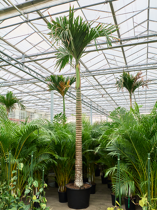 Deze indrukwekkende palm vraagt om een gelijkmatig vochtige grond. Geef regelmatig water, maar zorg dat er geen water onderin de pot blijft staan. In de lente en zomer kun je maandelijks wat palmvoeding toevoegen om haar vitaliteit te behouden. Besproei de bladeren af en toe met lauw water om ze stofvrij te houden en de luchtvochtigheid op peil te brengen. Zo blijft het blad mooi frisgroen en glanzend.