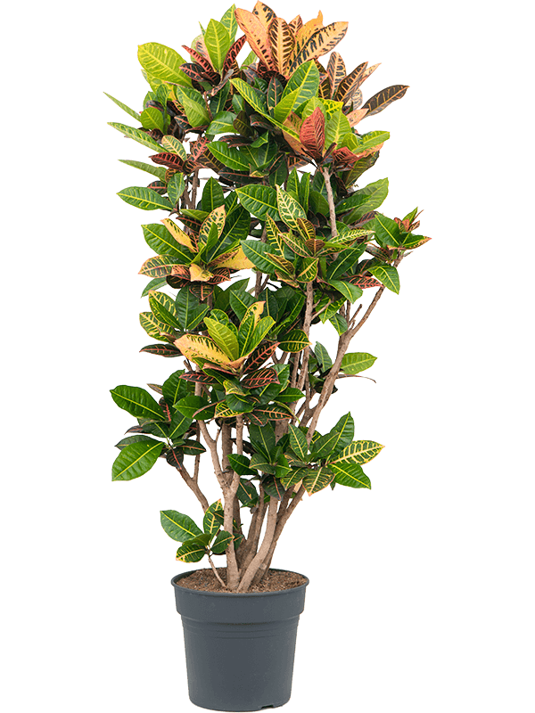 Croton 'Petra', bekend om zijn gigantische bladeren, trekt de aandacht met zijn palet aan bonte kleuren. De bladeren zijn glanzend en hebben een leerachtige textuur, met variërende patronen en kleuren gaande van groen en geel tot rood en oranje. Deze plant kan uitgroeien tot een lengte van 3 meter en wordt vaak gebruikt als sierplant vanwege zijn opvallende uiterlijk en gedurfde kleuren.