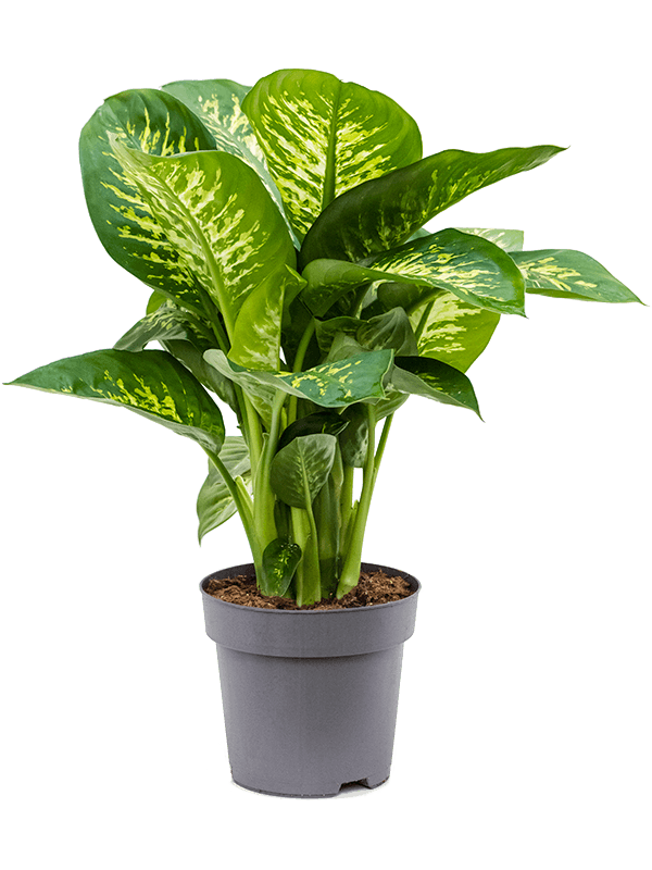 De Dieffenbachia seguine 'Reeva' is een vaste plant die wordt gekenmerkt door zijn grote, opvallende bladeren. Deze bladeren zijn groen met witte of crème kleurige strepen en kunnen uitgroeien tot een lengte van 30 centimeter. De plant kan in optimale omstandigheden een hoogte bereiken tot 1,5 meter. De Dieffenbachia bloeit zelden en als het bloeit, produceert het kleine witte bloemen.