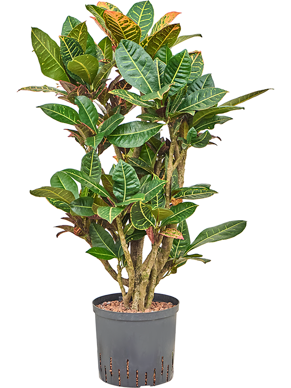 Croton 'Petra', bekend om zijn gigantische bladeren, trekt de aandacht met zijn palet aan bonte kleuren. De bladeren zijn glanzend en hebben een leerachtige textuur, met variërende patronen en kleuren gaande van groen en geel tot rood en oranje. Deze plant kan uitgroeien tot een lengte van 3 meter en wordt vaak gebruikt als sierplant vanwege zijn opvallende uiterlijk en gedurfde kleuren.