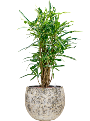 Codiaeum variegatum 'Banana' onderscheidt zich door zijn bladeren die een unieke banaanvorm hebben. Ze worden gekenmerkt door een mix van groene, gele en rode kleuren, afhankelijk van de rijpheid van het blad. De plant groeit in het algemeen traag en kan variëren in grootte - van kleine planten van ongeveer 30cm hoog tot grotere struiken tot wel 3m hoog. De 'Banana' variëteit produceert zelden bloemen en staat in de kamerplantenwereld vooral bekend om zijn aantrekkelijke, bonte bladeren.