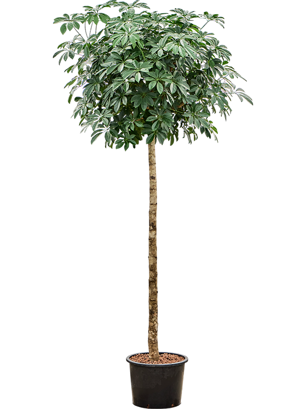 De Schefflera arboricola 'Compacta' is een populaire kamerplant die gekenmerkt wordt door haar compacte groeiwijze en glanzende groene bladeren. De bladeren van deze plant zijn kleiner en hebben een dichtere groei dan de standaard Schefflera arboricola. De bladstand lijkt op miniatuur handen of vingers die uit een stok komen. De plant kan uiteindelijk tussen de 1 tot 1,5 meter hoog worden.