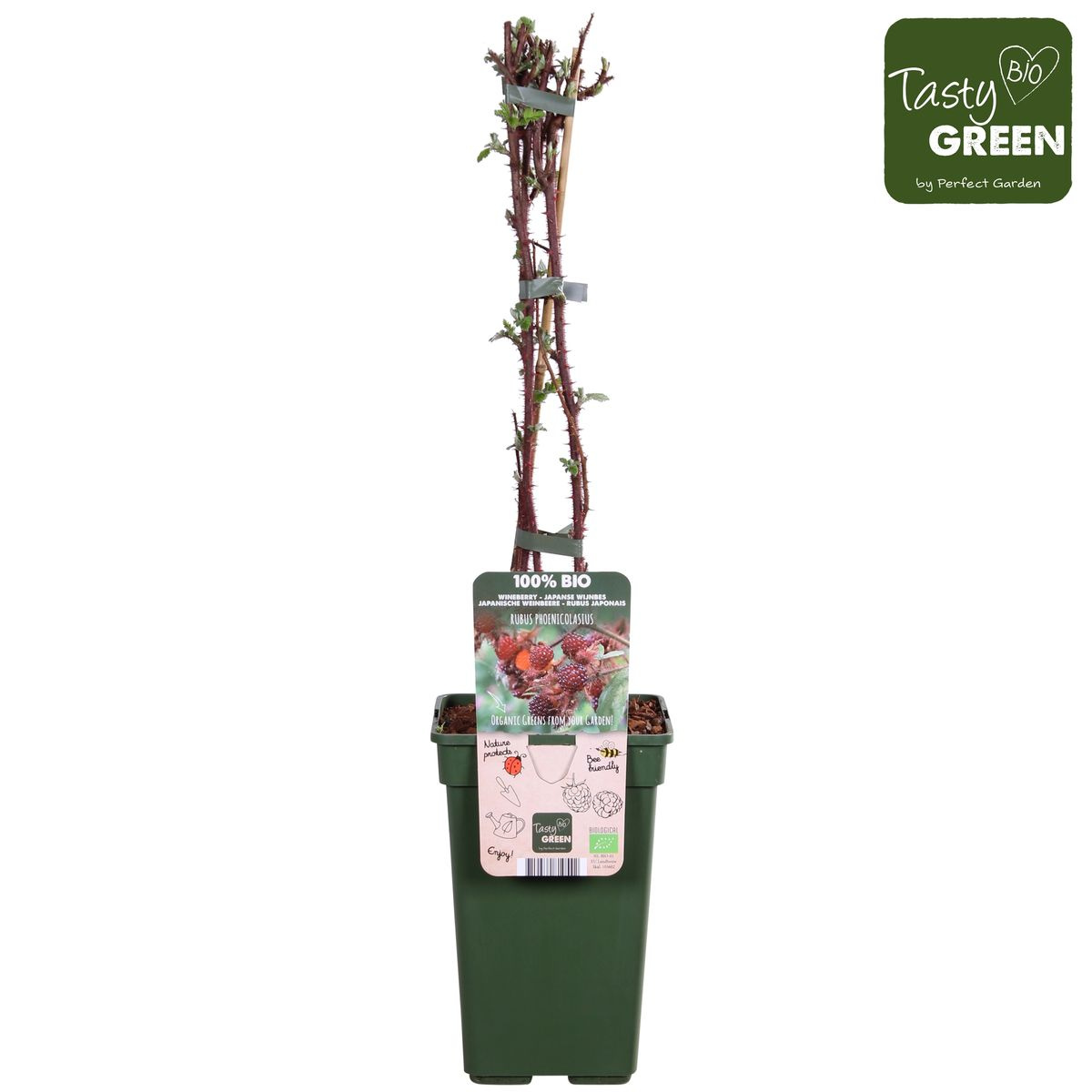 ‘Rubus Phoenicolasius’ is een Japanse wijnbes. Het is een decoratieve klimplant die bovendien ook nog lekkere vruchten heeft. De Japanse wijnbes stamt werkelijk uit Japan en is nauw verwant aan braam en framboos. De vruchten zijn rood van kleur en zijn vers geplukt het smakelijkst. De vruchten hebben een wat flauwe, frisse, zoetzure smaak en zijn erg vitamine rijk. Ze voelen wat kleverig aan. Hoe donkerder de kleur des te meer smaak ze krijgen. De stengels van de Japanse wijnbes hebben stugge haren en zijn rood van kleur deze geven de plant een exotisch uiterlijk. Elk jaar bloeit de bes op het hout van het voorgaande jaar en maakt elk jaar weer nieuwe takken waar het jaar erop vruchten aan komen. Het hout wat vrucht gedragen heeft kan in de winter gesnoeid worden en de nieuwe takken kunnen in de winter blijven staan. De Japanse wijnbes bloeit elk jaar in mei en juni. Bijen en hommels zijn gek op deze plant als hij in bloei staat. De oogst is in juli en augustus. Hij houdt van een zonnige standplaats en staat het liefst in een humusrijke, vochtige grond.