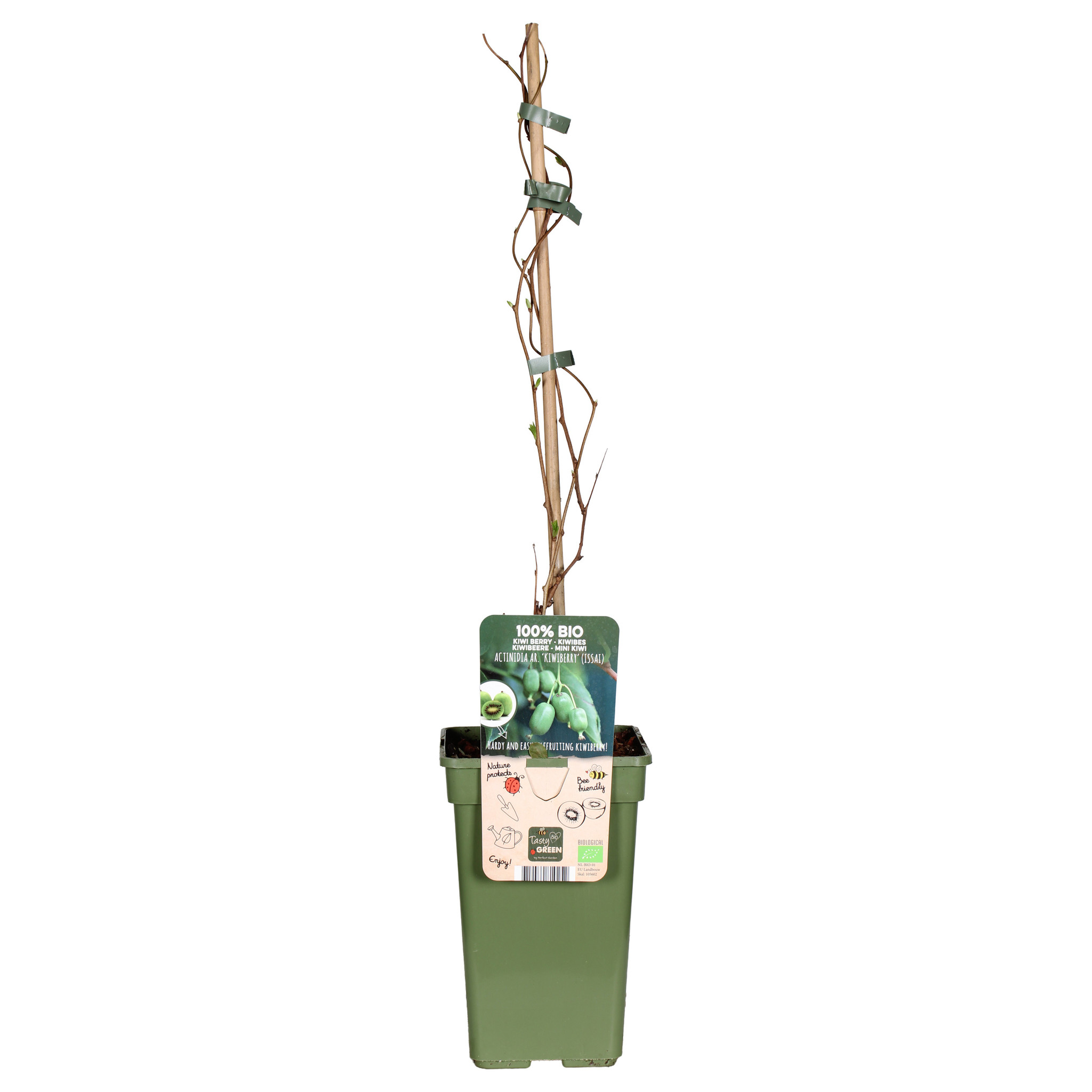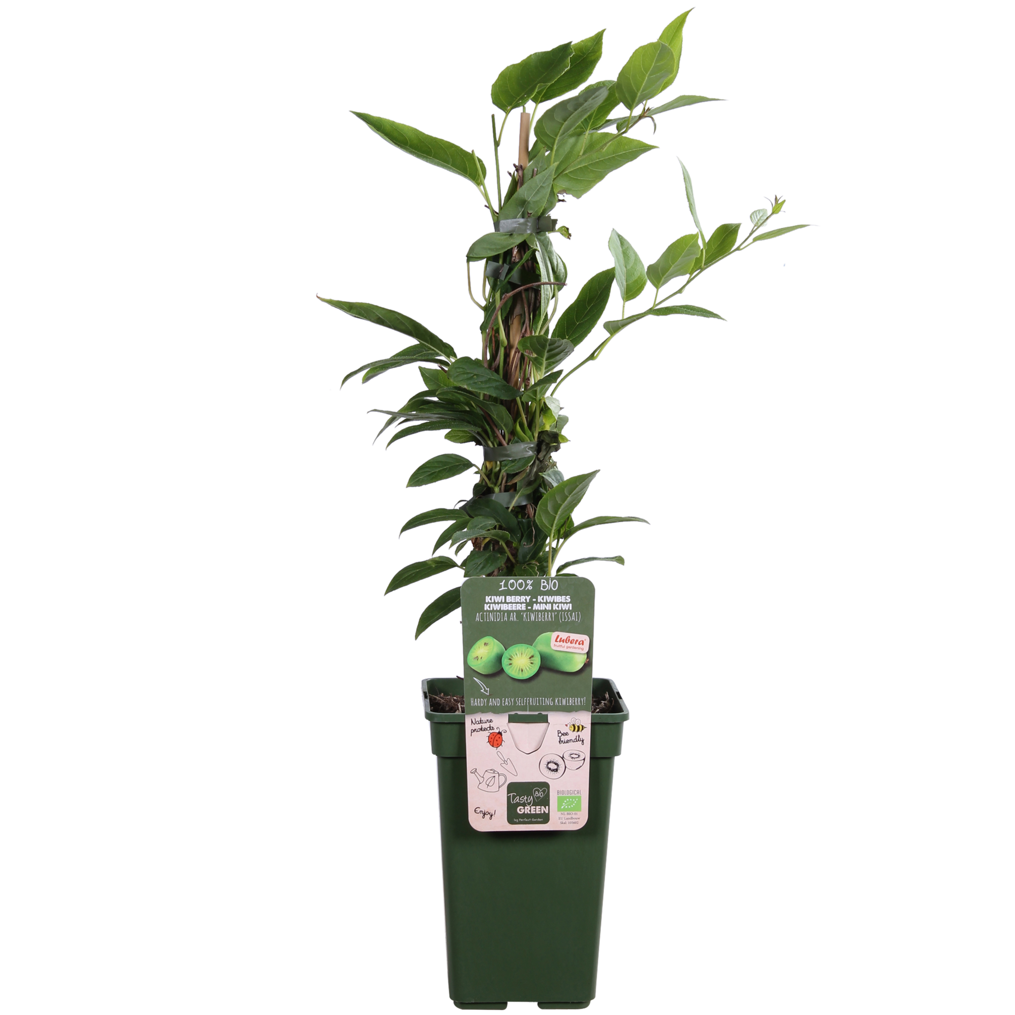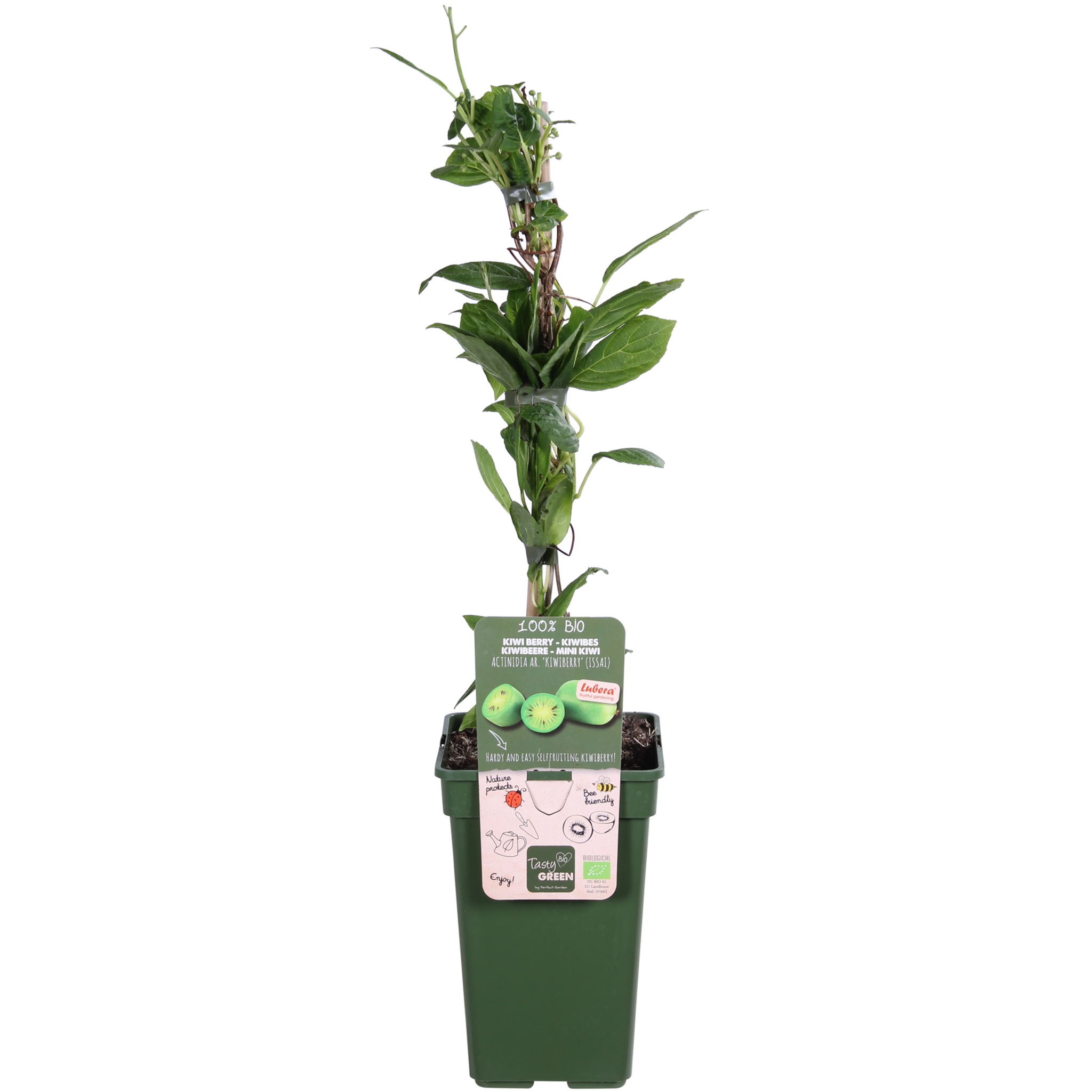 ‘Actinidia arguta Kiwiberry Issai’ is een zelfbestuivende kiwibes die al op jonge leeftijd kleine, gladde, haarloze vruchtjes geeft. Hij is ook wel bekend onder de naam mini-kiwi. De vruchten zijn zonder te schillen op te eten en rijk aan vitamine C. Ze hangen in grote trossen aan de plant, vaak gecamoufleerd tussen het blad. De opengesneden vrucht doet denken aan een miniatuur kiwi, een witte kern met daaromheen een ring van zwarte zaden en het typische lijnenpatroon. De zoete, groene bessen zijn klaar om geplukt te worden in augustus- september en zijn zo’n 2 tot 3 cm groot. Behalve vers, kunnen de vruchten ook op verschillende manieren verwerkt worden, zoals jam of compote. Ook zijn de doorgesneden vruchtjes fraai als garnering bij hapjes of desserts. De vruchten worden ook wel gedroogd en er kan zelfs wijn van worden gemaakt. De kiwibes is een klimplant en daarom kan je hem het beste helpen door hem te leiden langs een muur, klimrek of pergola. Het blad van de klimplant is langwerpig, van boven glimmend donkergroen en van onderen lichter groen. De kiwibes bloeit in juni- juli met roomwitte bloemen. Hij is volledig winterhard en kan temperaturen tot -25 °C goed verdragen. Plant de kiwiplant op een zonnige, enigszins beschutte plek.