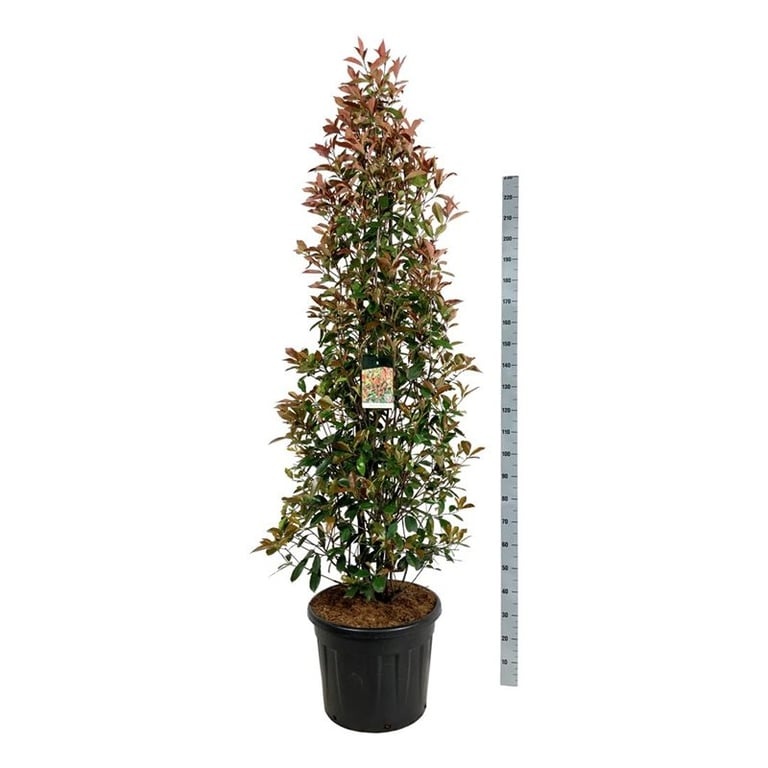 De Photinia fraseri Red Robin, ook wel bekend als glansmispel, is een populaire en decoratieve buitenplant die direct kleur en structuur toevoegt aan de tuin. Deze plant staat vooral bekend om zijn opvallende jonge uitlopers, die in het voorjaar en na snoei helder rood kleuren en prachtig contrasteren met het donkergroene, glanzende blad. Met een hoogte van circa 260 cm en een potmaat van 55 cm is dit een groot en volwassen exemplaar dat uitstekend geschikt is als solitair, als onderdeel van een haag of als stijlvolle blikvanger in een ruime border. De Photinia Red Robin zorgt het hele jaar door voor een verzorgde en levendige uitstraling.