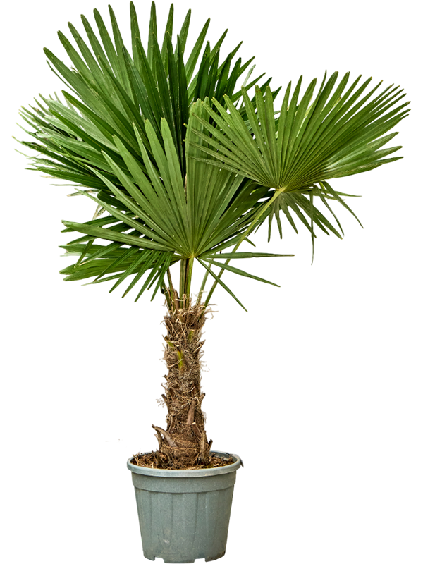 De Trachycarpus fortunei is een stoere, robuuste palm die dapper elke weersomstandigheid trotseert en daardoor een favoriete keuze is voor velen. Deze plant bereikt een gemiddelde hoogte van 12 tot 20 meter en heeft grote, waaiervormige bladeren, die hem zijn naam geven. De stam is bedekt met vezels, wat ongewoon is voor palmbomen. Bovendien draagt hij in de zomer onopvallende, maar geurige bloemen die later veranderen in donkerpaarse, eetbare vruchten.